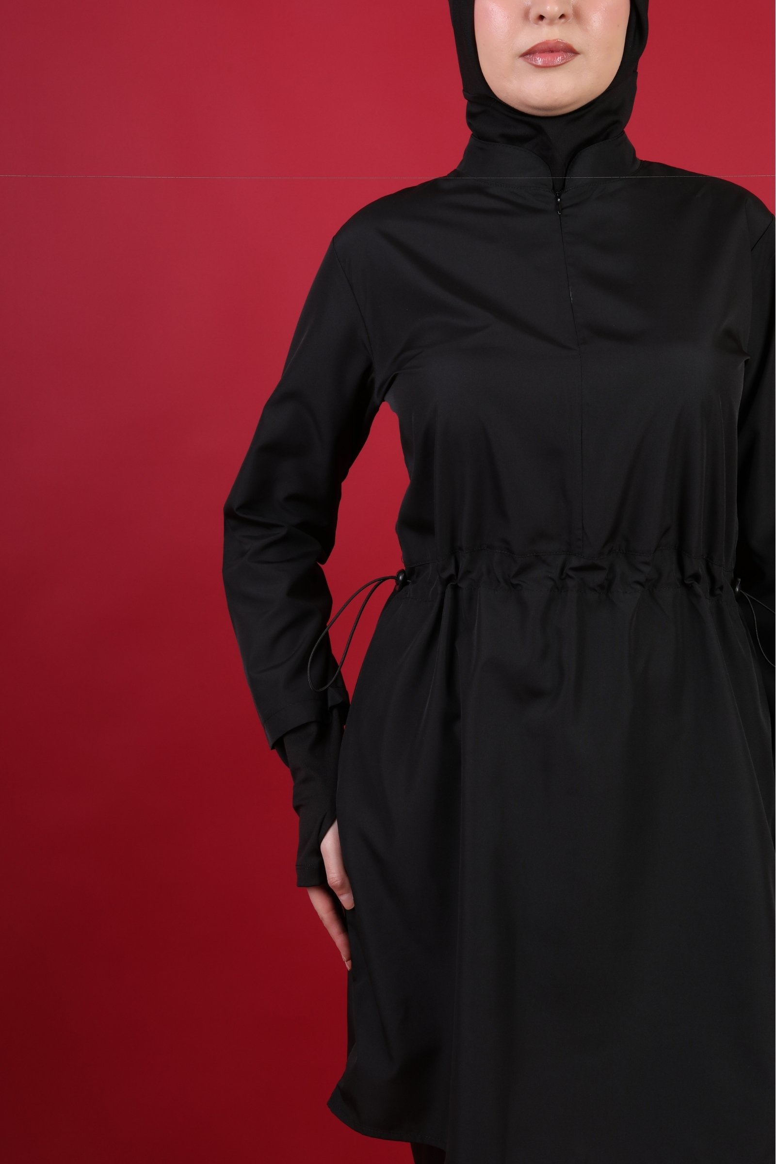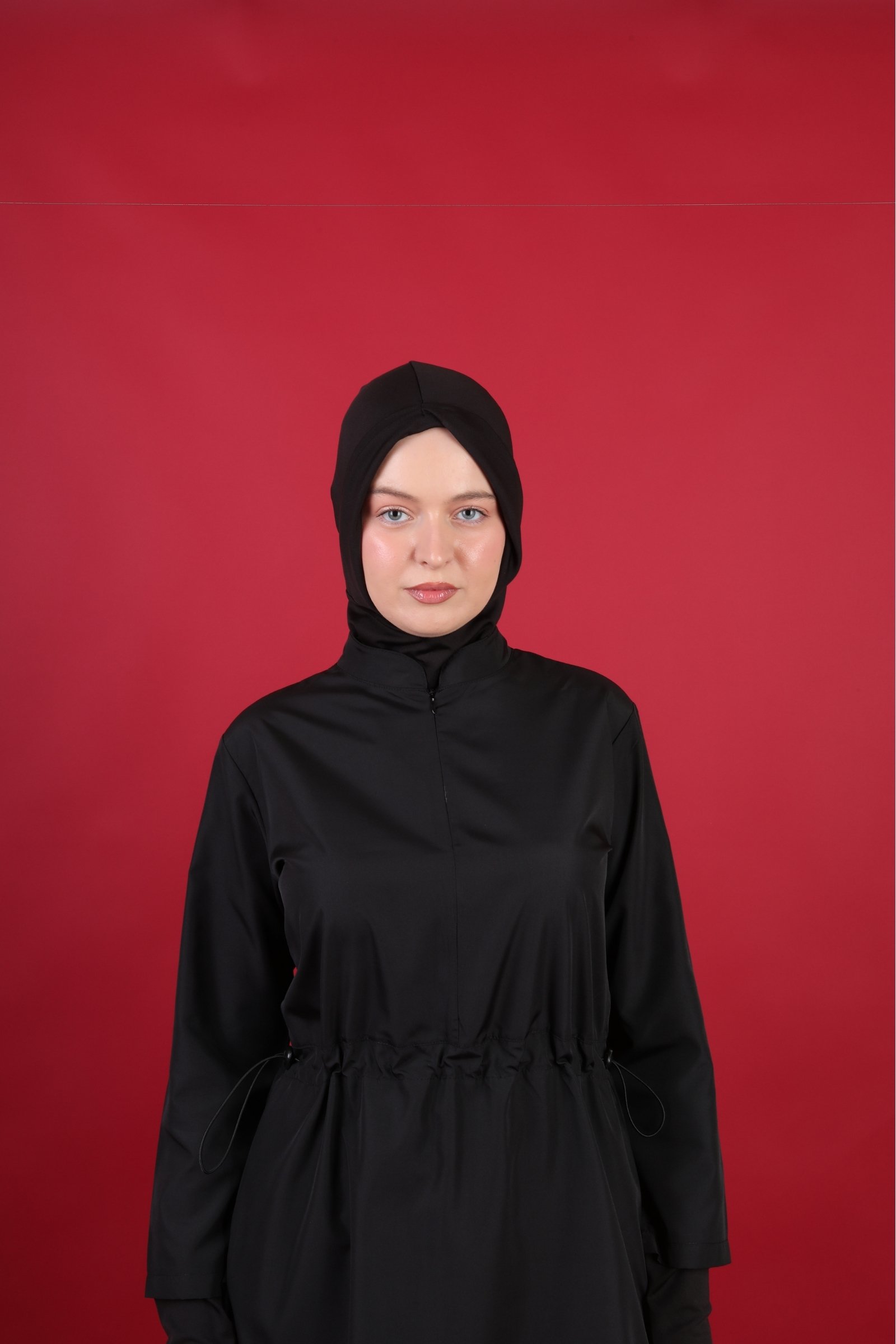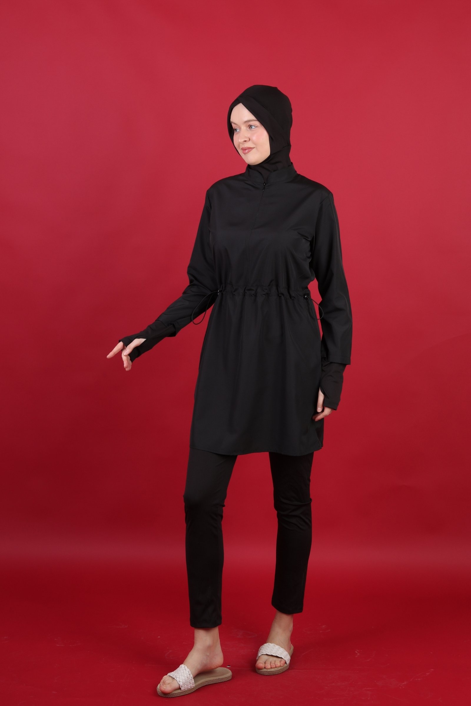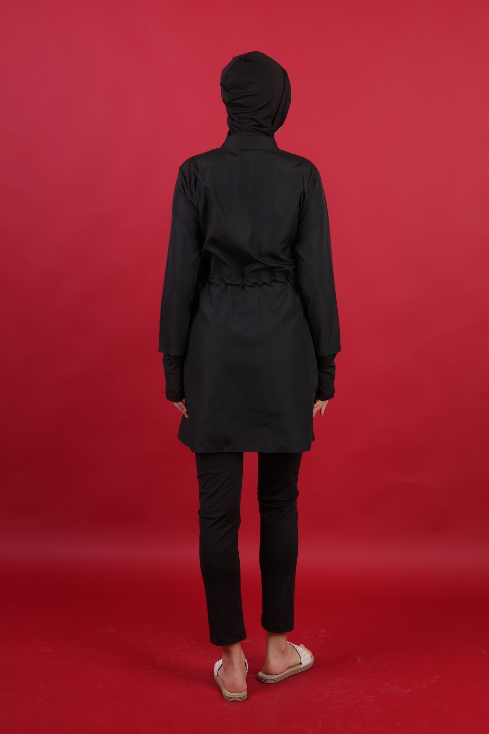 Beli Kordon Detaylı Siyah Tam Kapalı Tesettür Mayo Hakim Yaka 3’lü Su İtici Kumaş