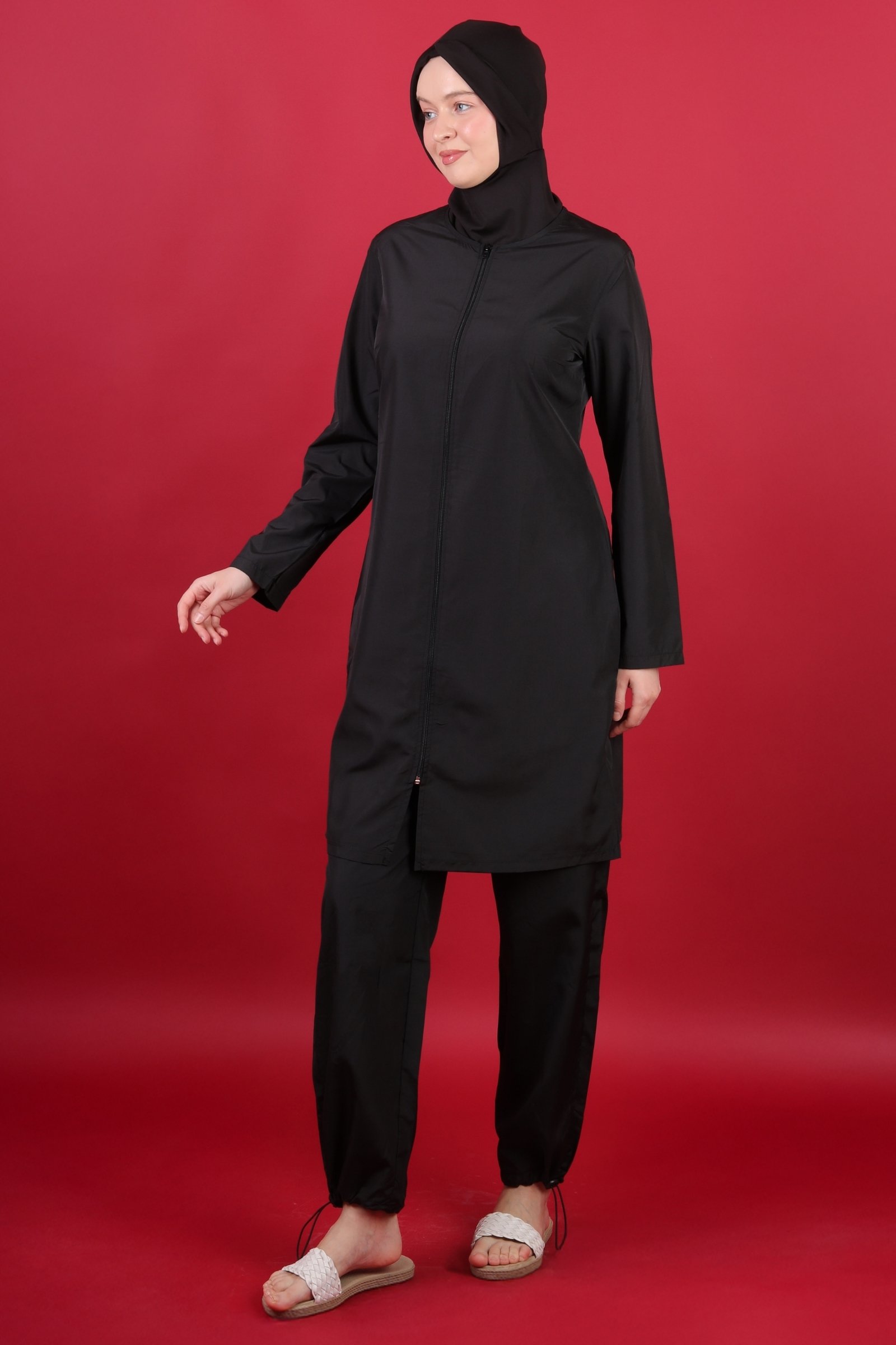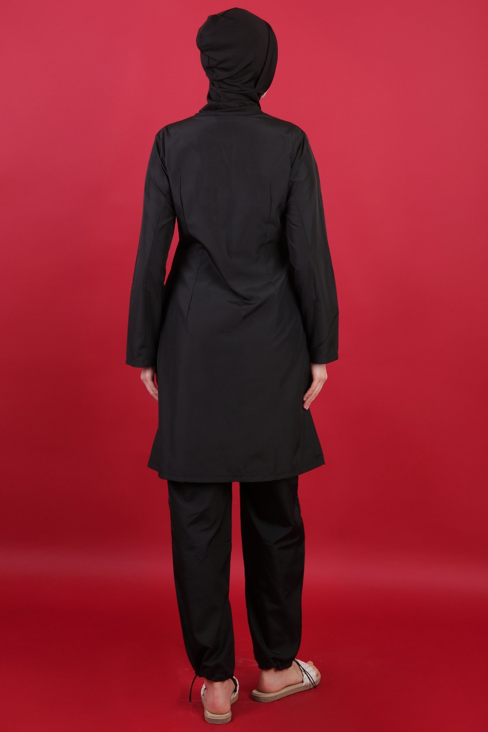 Düz Paraşüt Tam Kapalı Tesettür Mayo Siyah 3’lü Su İtici Hızlı Kuruyan Takım