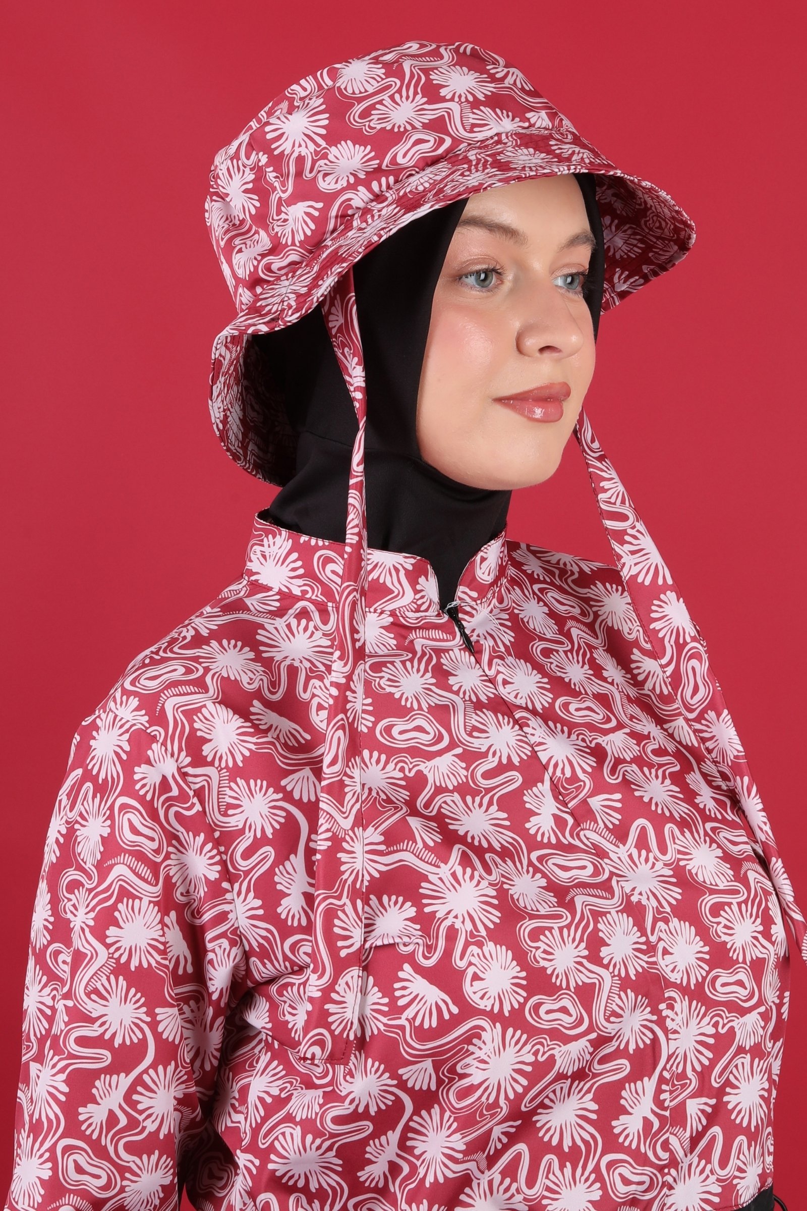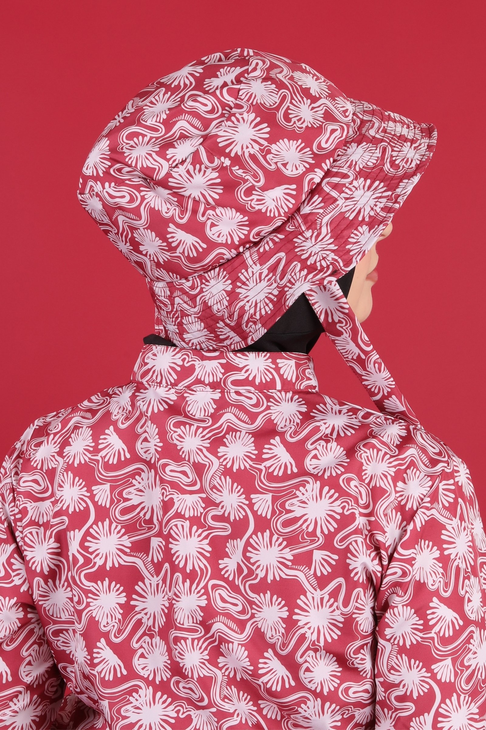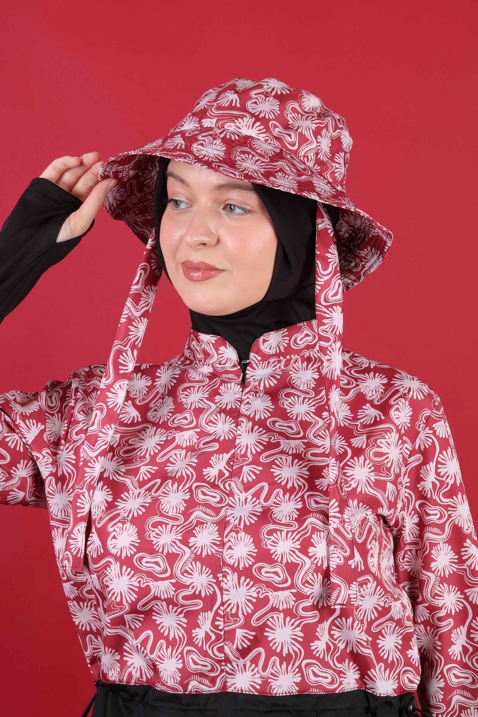 Kırmızı soyut desenli tesettür mayo şapkası, dikkat çekici görünümü ve rahat kullanım özellikleriyle kombinlerinize hareketli ve modern bir hava katar.